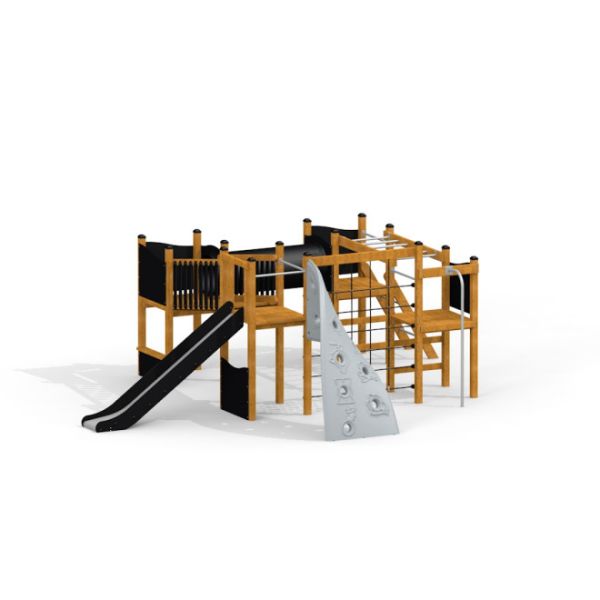 Haastekeskus II natur kutsuu lapset aktiiviseen leikkiin ja haastaa heidät kehittämään motorisia taitojaan monipuolisten toimintojen äärellä. Tämä innovatiivinen leikkikeskus yhdistää luonnonmateriaalien lämpimän ilmeen ja modernin leikkivälineen monikäyttöisyyden, tehden siitä täydellisen valinnan kaikenlaisiin ulkoilutiloihin.