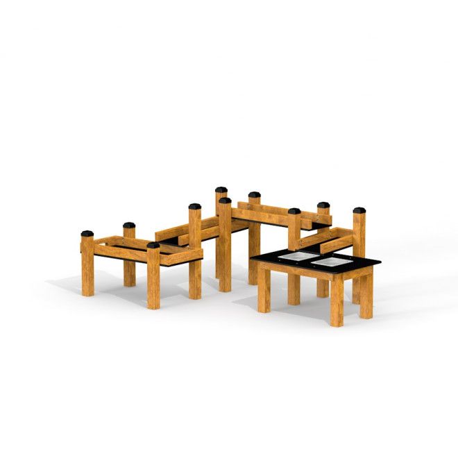 Keskuksen rakenteessa on hyödynnetty lehtikuusipuuta, ruostumatonta terästä, kierrätettyä HDPE-muovia sekä PE-materiaaleja. Näiden laadukkaiden ja kestävien materiaalien ansiosta leikkikeskus kestää aktiivista käyttöä ja vaihtelevia sääolosuhteita, säilyttäen samalla luonnonläheisen ilmeensä vuodesta toiseen.